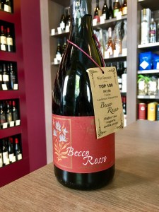 Con lui sistemiamo in vetrina e sugli scaffali quello che sarà il vino del mese di Maggio, il Lambrusco Grasparossa DOP Becco Rosso di Podere Fiorini.