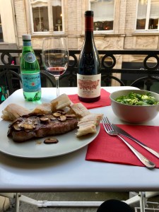 Si tratta di un Lambrusco dal colore rosso rubino fitto con riflessi purpurei sui bordi, che con la sua lieve bollicina porta brio e voglia di condividere la bevuta. È gentile e i profumi che riconosco sono legati alle more, i mirtilli e lievi piccantezze un po’ pepate, senza ovviamente tralasciare il suo animo ancora un po’ vinoso (tipico della categoria). Il sorso è snello, animato da una corroborante acidità che sveltisce la beva e spegne l’arsura del cavo orale, la sua forza sta nel non avere residuo zuccherino, presentandosi quindi teso e vivace. È una bevuta intrigante che piace molto ai clienti dell’Enoteca, perfetto in abbinamento a culatello, coppa piacentina o salame di Felino. Ah si è beccato pure gli 89/100 da Wine Spectator! La giornata prosegue mentre sistemiamo i prodotti negli scaffali e e controlliamo le date di scadenza dei generi alimentari. A fine turno ho il tempo di acquistare qualcosa per me, vista la bontà della selezione effettuata da Inge, prendo 3 bottiglie di vino, tonno sott’olio, riso (perchè un risotto me lo voglio proprio fare) e qualche verdura sott’olio. Chiudiamo la porta e vado al supermercato per acquistare alcune cose che mi sono venute in mente. Giungo allo store e girellando vedo una invitante selezione di bistecche di manzo di varie razze, scelgo di provare una francese dalla Normandia, poi prendo qualche funghetto, insalata, broccoli e 3 formaggi. Rincaso verso le 19.30 e mi metto ai fornelli per preparami la gustosa bistecca agguantata con feroce curiosità qualche minuto prima, e la abbino a funghi saltati in padella e insalata mista. Apro una bella boccia, un Etna Rosso DOC AETNUS 2010 de I Custodi delle vigne dell’Etna.