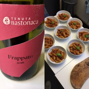 Questa è un operazione che va eseguita con precisione e minuziosità, per creare un perfetto layout dei diversi strati che inserirò, poichè prima di servirla aggiungerò un crumble fatto con i famosi biscotti piemontesi alla nocciola chiamati Baci di Dama e qualche foglia di menta. Sarà una golosità me lo sento! Finisco appena in tempo per l’assalto dei clienti, che da mezzogiorno fino alle 19.00 entrano continuamente senza farci mai dare un occhio all’orologio, cosa molto positiva. Mentre l’ultimo tavolo di cinque persone imperversa nelle chiacchiere post-vino noi cominciamo a preparare il lungo tavolo per la cena privata che Inge ha organizzato per una cliente molto gentile e appassionata di vino e cucina. Questa sera avremo 10 ospiti che ceneranno intorno al lungo tavolo della condivisione posto al centro dello shop, facendo un viaggio in varie regioni d’Italia. Il menu prevede il servizio di un Pignoletto “Spazzavento” Spumante di Torre dei Nanni che accompagnerà i taglieri di affettati, due a tema Friuli (con prosciutto, Speck e salame lievemente affumicati) e due a tema Emilia-Romagna (con strolghino, prosciutto di Parma e Mortadella). Dopo questa prima entreé sarà il momento delle Pennone di Gragnano all’Amatriciana, che verranno accompagnate con il Frappato IGT 2016 di Tenuta Bastonaca (servito lievemente fresco, per accentuarne i tratti giovanili e vibranti).