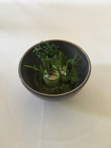 La prima portata è un appetizer con cetrioli ripieni di yogurt, erbe varie, menta, e semi di senape, un piatto che sembrerebbe amaro e che invece gioca tutto sulla sapidità e alcuni tratti lievemente dolciastri dello yogurt, un connubio rinfrescante e diretto che spolveriamo in un nano-secondo.