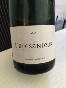 Il primo vino che ci viene servito è un vino frizzante naturale proveniente dal Sud della Francia, creato con Carignan e Grenache Noir, di origine biodinamica che mi rimanda agli italici Lambruschi ancestrali, con un colore mattonato e aromi che ricordano la ciliegia e le spezie scure, fresco e molto secco con un finale che mi ricorda il malto d’orzo.