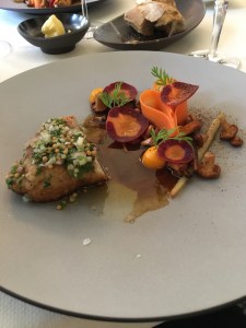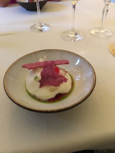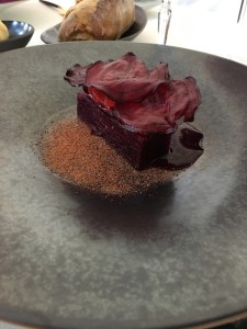 L’abbinamento perfetto si ha con questo piatto a base di barbabietole marinate, fragole selvatiche, merluzzo mantecato e chips di barbabietole, adagiate su di una salsa a base di barbabietole e succo di fragole. Un’inno all’equilibrio tra acidità e sensazioni terrose, fantastico!