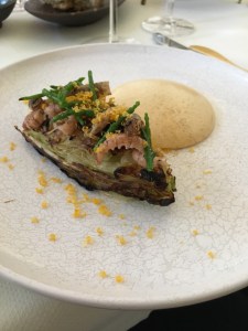 Scegliamo un Blac de Blancs Extra Brut di Charlot-Tanneux, uno Chardonnay in purezza da Mardueil (Valle de La Marne) con profumi biscottati e marzapane, che in bocca crea un ottimo mix tra vivacità e ricchezza retro-olfattiva, ottimo per cominciare con stile. Optiamo per il menu degustazione con i vini in abbinamento, e proseguiamo le nostre chiacchiere, in cui ci scambiamo le positive reciproche impressioni su questa esperienza lavorativa che ci ha visti collaborare per quasi due mesi. Finito lo Champagne entriamo nella splendida e luminosa sala, in stile neo-barocco di Anversa, con un elegante tocco francese.
