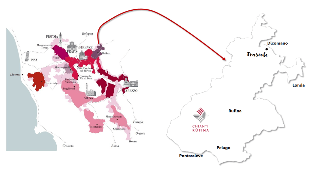 “Il vino di Firenze”. Così è sempre stato appellato il Chianti Rufina, poichè questo areale (a circa 20 km dal centro di Firenze) per decenni ha ricoperto il ruolo di primo fornitore enoico dei locali e dei ristoranti della bella capitale toscana. Da qui partivano i carri caricati “a cesta” in cui i fiaschi (tipiche bottiglie toscane, impagliate e con una capacità di 2,280 litri) venivano impilati magistralmente in vari livelli, fino a formare una struttura simile alla chiglia di una nave. Un collegamento diretto, che vedeva i produttori costeggiare il fiume Sieve per raggiungere le vie di Firenze, dove potevano commerciare i loro vini. Un legame indissolubile, che tutti noi fiorentini percepiamo come storico e ancestrale, e che cerchiamo di onorare continuando a scegliere il Chianti Rufina come il vino da porre sulla nostra tavola. Questa zona affascinante si snoda intorno alla vallata della Sieve, e ingloba i comuni di Pontassieve, Pelago, Rufina, Dicomano e Londa, che insieme rappresentano l’ultima frontiera prima di scollinare ed entrare nelle fresche valli del Mugello. All’interno di questo comprensorio (già individuato nel 1716 da Cosimo III de’Medici come area di alta qualità con il nome di Pomino) il territorio e l’ambiente rappresentano i fattori distintivi che delineano le caratteristiche qualitative che differenziano i vini della Rufina rispetto a tutti gli altri della grande denominazione del Chianti (nata nel 1932, divenuta DOC nel 1967, e passata a DOCG nel 1984). I terreni ricchi di galestro e alberese, la altitudini che arrivano a lambire i 400 metri s.l.m., le calde esposizioni a solatio e i freschi venti appenninici, fanno sì che qui si creino dei vini freschi, con nette dotazioni polifenoliche (derivanti dall’ottimale maturità che raggiungono le uve) e con un’innata longevità.