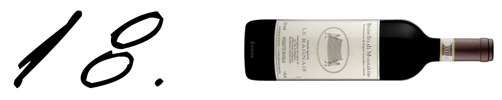 Riccardo Campinoti è l’artefice di un sogno chiamato Le Ragnaie, la sua visione d’ensemble che rappresenta il lato classico e austero del grande Sangiovese targato Montalcino. Il cemento, i lieviti indigeni e le botti, sono gli strumenti che utilizza per plasmare il succo delle uve provenienti da vari settori della Denominazione. Questo suo Brunello, rappresenta il rispetto dell’idea iniziale di Clemente Santi, un vino d’assemblaggio, che fa coesistere al suo interno le varie caratteristiche di questo splendido territorio. Granato, dotato di luce propria e di spiccata sensualità. È balsamico, sà di marasca, oli essenziali d’agrume, sigaro toscano e foglie umide. Il sorso è un tracciante che corrobora, ha nerbo tannico, vibra grazie all’acidità e chiude con un sussurro urlato, un vero ossimoro dell’arte di rendere straordinario il Brunello di Montalcino.