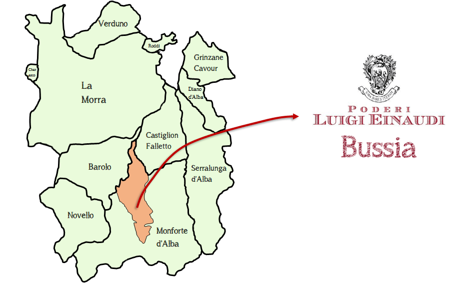Il vino di oggi è prodotto tramite l’ultimo vigneto entrato a far parte della scuderia degli Einaudi. Esso proviene dal Cru Bussia, sito nel comune di Monforte d’Alba, una delle menzioni più ambite tra gli 11 comuni del Barolo. Questa zona, emersa durante il Serravalliano (tra i 13 e gli 11 milioni di anni fa) origina vini dalla forte struttura, complessi ed eleganti e, cosa molto importante, estremamente longevi. Queste caratteristiche si esaltano grazie al tipo di terreno, che vede alternarsi le “Arenarie di Diano” (una formazione di sabbie compatte gialle e grigie) a marne e calcari (mano a mano che ci si avvicina al comune di Barolo).