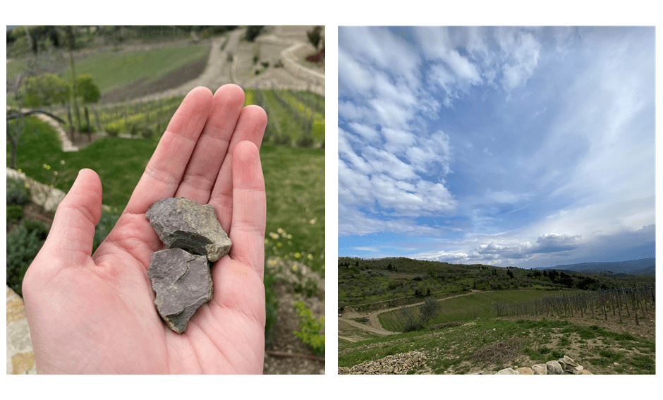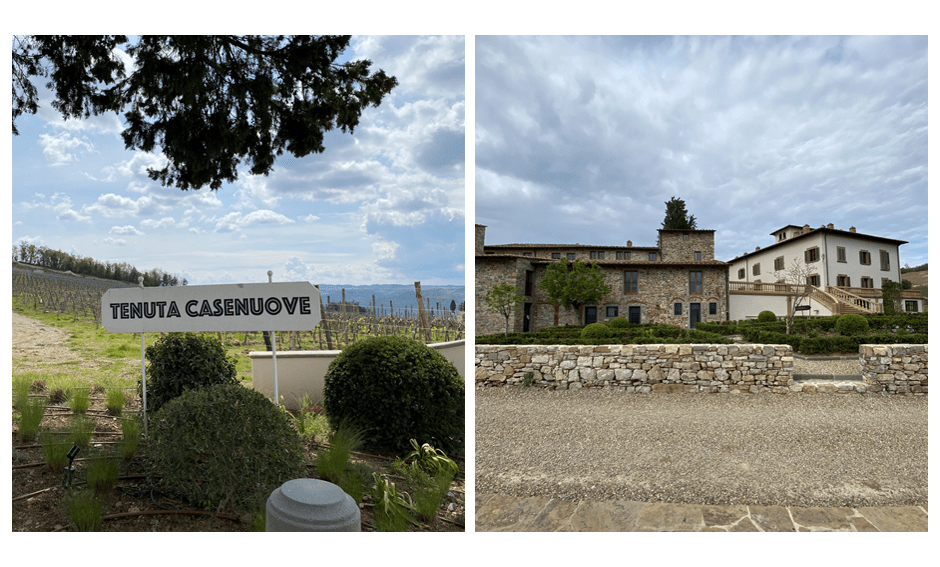 Lo spettacolo entra nel vivo quando la degustazione si trasferisce in una candida saletta che guarda la lontana vallata della Pesa, qui si racconta la storia del nuovo corso di Tenuta Casenuove, si susseguono tutte le annate prodotte di Chianti Classico, Chianti Classico Riserva, Toscana IGT e l’anteprima del Chianti Classico Gran Selezione. Un viaggio dalle prime vinificazioni del 2015 sino ad oggi, che narra di un’evoluzione stilistica legata principalmente alla comprensione del territorio, avvenuta grazie alla vinificazione per parcelle, che ha fatto sviluppare una profonda consapevolezza del modus operandi da seguire. L’approccio è legato al voler esaltare il Sangiovese (principe dei vigneti chiantigiani) e le differenti peculiarità che esprime all’interno dei vigneti. Essi si diramano tra i 350 e i 480 metri e poggiano su terreni ricchi di scheletro, con particolari faglie di galestro rosso che appaiono soprattutto nelle zone più elevate. Una grande sfida per Cosimo Casini e Maria Sole Zoli (gli enologi interni) che nel corso degli anni hanno saggiato, provato ed evidenziato il carattere teso e vibrante di questa parte di Panzano. Sono proprio loro, a sottolineare l’approccio della proprietà e della squadra di Stéphane Derenoncourt (l’enologo consulente, molto attivo nel Bordeaux) che è volto ad esaltare la tipicità e a contrastare l’omologazione.