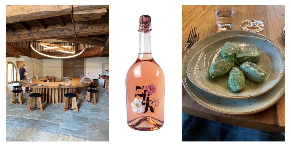 Durante il pranzo, creato ad hoc dallo Chef Pietro Aprigliano, viene presentato il neonato “Ziik”, un rosè spumantizzato con il metodo Charmat, creato attraverso i grappoli di Sangiovese vendemmiati precocemente, una pratica moderna per “non buttare via niente” e rendere utili anche i diradamenti pre-vendemmiali. Si tratta di un vino molto delicato, dalle fattezze “provenzali”, con un basso residuo zuccherino ed una serbevolezza davvero rimarchevole. Ottimo in abbinamento con gli gnudi (ricotta ed ortica) al burro e salvia.